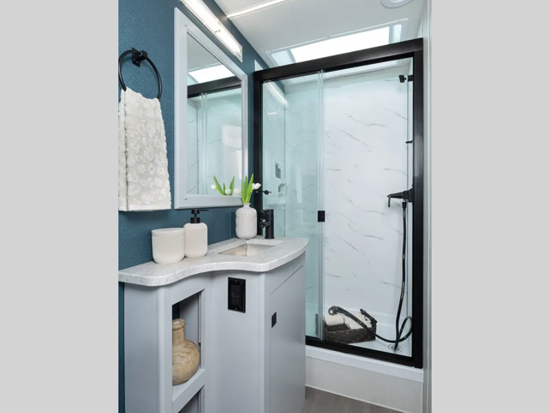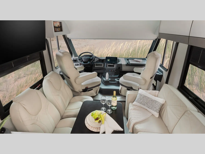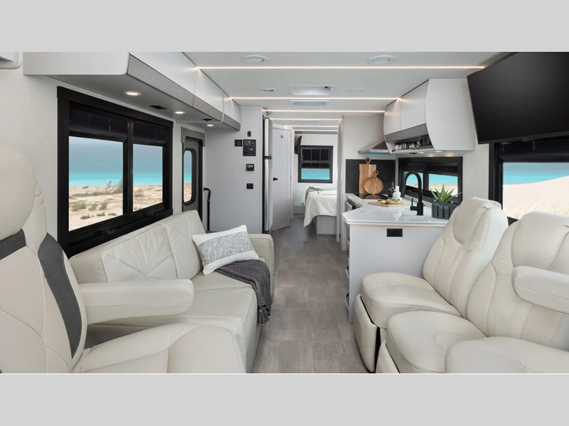 You will love the interior with its stainless steel appliances, modern decor, and generous cabinet space for all your belongings. There are also stylish square windows with day/night shades that will provide better views of your landscapes and an Easy Clean cockpit floor. Automatic leveling jacks also come standard on most models, along with a power patio awning, radius trunk doors, and an 8,000 lb. towing hitch for your hauling needs.
