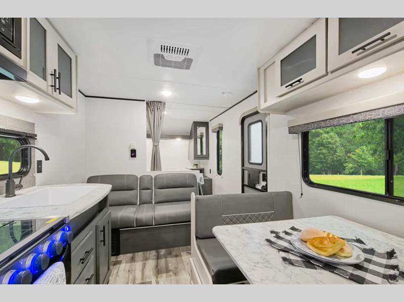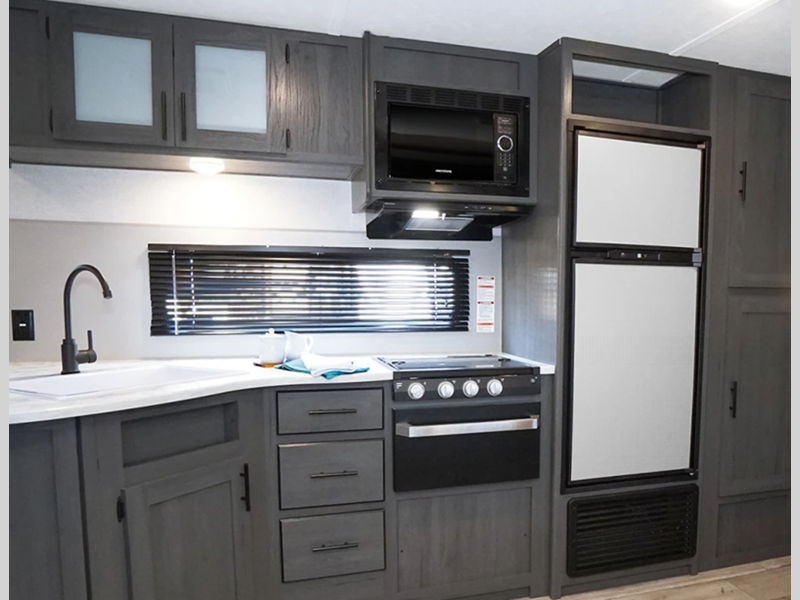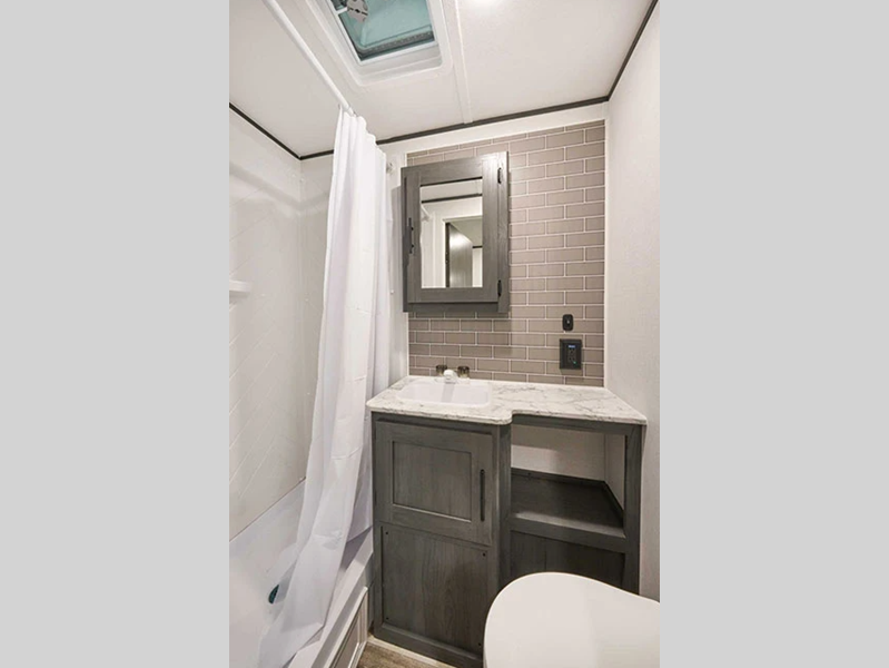Each is built with a heated and enclosed underbelly for added protection against the elements, plus there is a power tongue jack and electric stabilizer jacks for easy set up. The 6' 10" interior height inside will make your space feel more open, and the pleated night shades throughout will provide privacy and shade when needed.